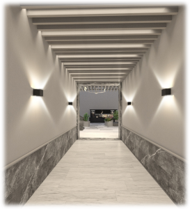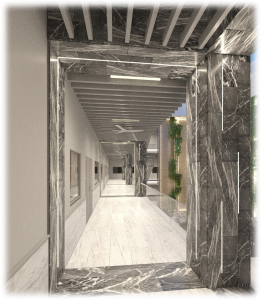 La fachada posterior está diseñada para facilitar operaciones logísticas, brindando acceso discreto y directo para carga y descarga mediante pasillo de servicio, sin interferir con el tránsito de visitantes en áreas comerciales.
